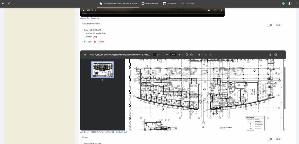 A history of the project is documented chronologically, as employees add notes, photos, or links to documents. These are added to the newsfeed and it serves as a message board and timeline. It can be browsed and filtered to easily access relevant details.